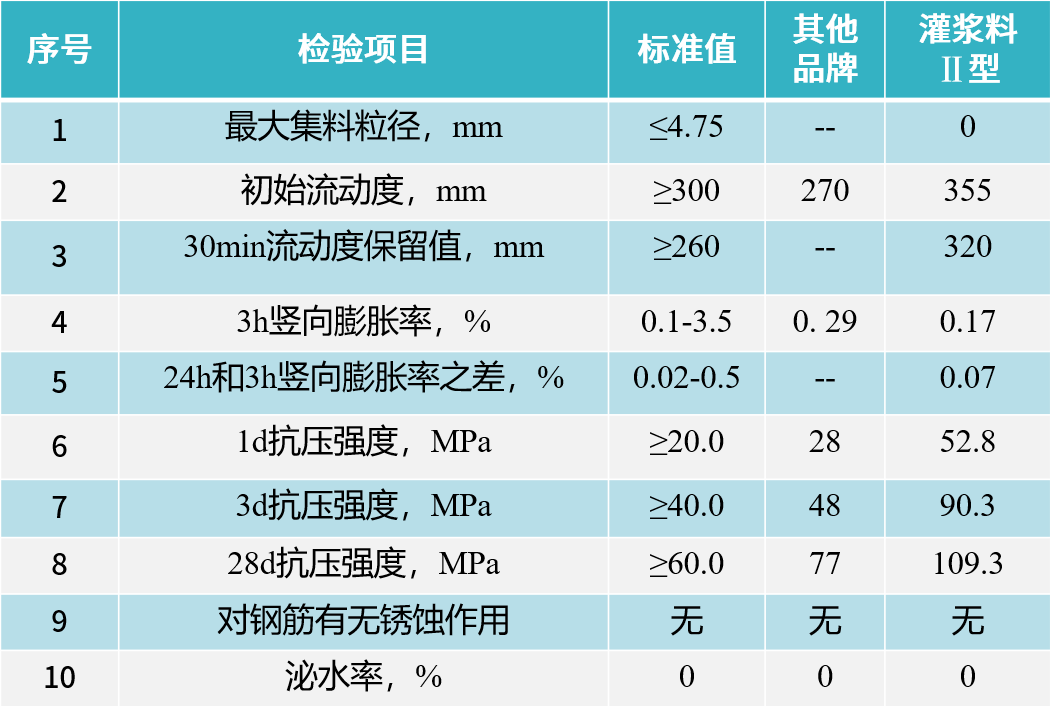 混合后的灌浆料应在2小时内用完,不得将已干燥的灌浆料加水搅拌后继续使用。 养护:灌浆料初凝后,应立即加盖湿润土工布或湿草袋,确保湿润。 |